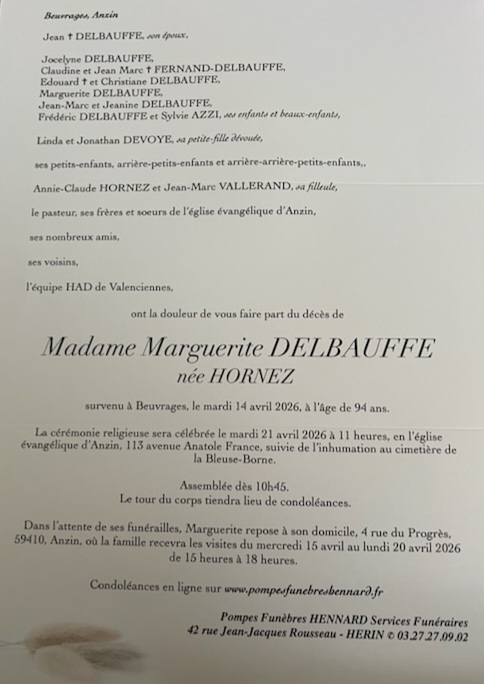 - Mardi à 11h – Service de funérailles de Marguerite DELBAUFFE (Faire-part ici)