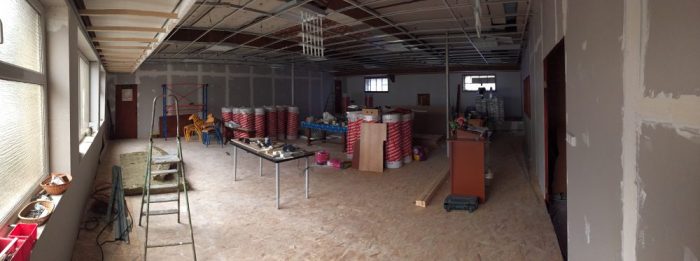 Les différentes normes liées à l’accessibilité et à la sécurité nous ont conduits à prévoir des travaux de rénovation de la grande salle de culte… cette salle est bien partie pour être moderne et très accueillante ! Un effort particulier est fait pour améliorer l’isolation (murs, sols et plafond, remplacement de certaines fenêtres), la sonorisation et la vidéo-projection. Merci à tous, à Jacques en particulier qui pilote les travaux.